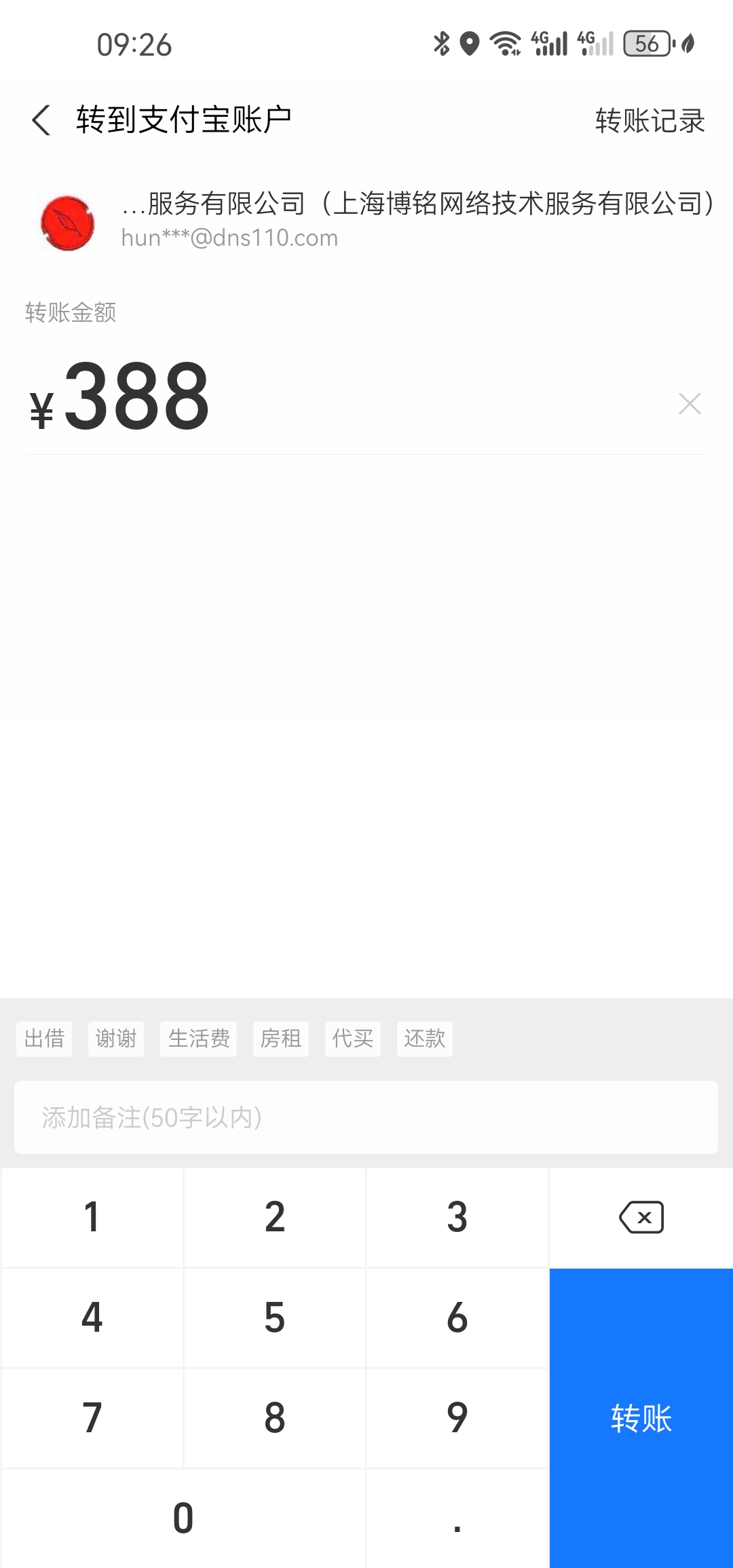 2、輸入收款方Email、付款金額、備注(請確認收款賬號是:上海博銘網絡技術服務有限公司)。
