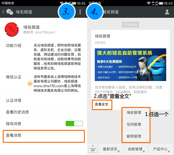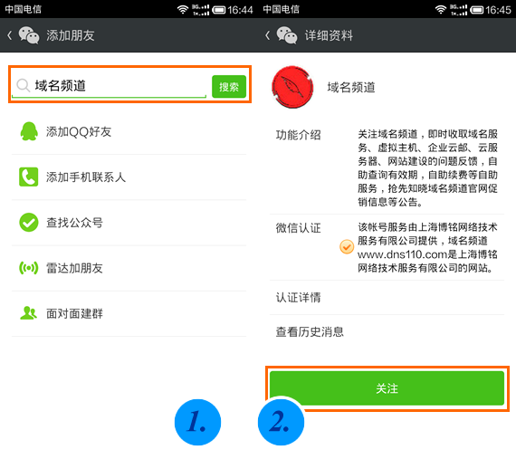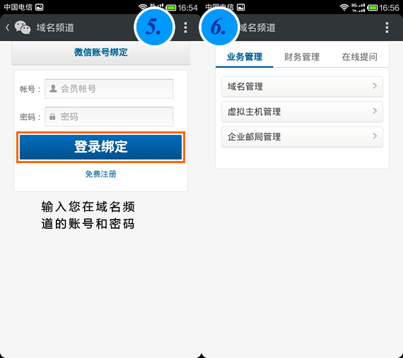 打開微信手機,添加朋友,搜索域名頻道微信號:域名頻道,關(guān)注域名頻道微信號。進入自助管理,系統(tǒng)將自動提示您輸入帳號密碼綁定!如下圖所示!